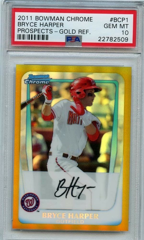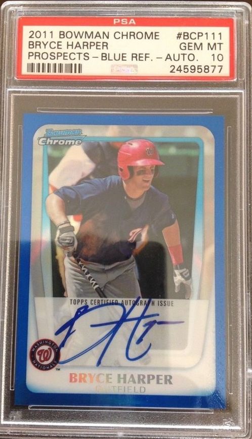The 2011 Bowman Chrome Prospects Bryce Harper #BCP111 Blue Refractor Autograph card’s shine isn’t fading. A PSA gem mint raked in $5,600 in July 2019 on eBay, and another crossed home plate at $7,200 to cap off 2021—making the 2011 Bowman Chrome Prospects Bryce Harper #BCP111 (Blue Refractor-Autograph) one of the most valuable Bryce Harper rookie cards.