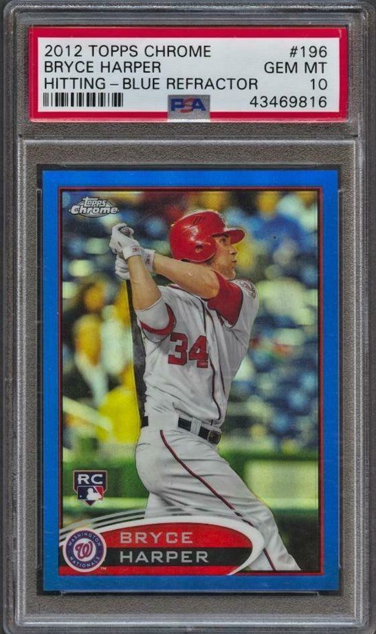 The 2012 Topps Chrome Bryce Harper #196 Hitting Blue Refractor card has seen a spectacular increase in value, especially the PSA gem mints. In 2017, these were commanding around $299 to $333 each on eBay. Fast forward to 2020, the price climbed significantly to around $475.