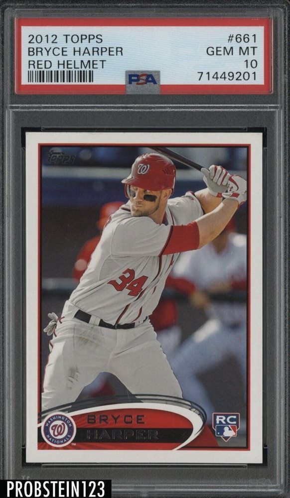 The 2012 Topps Bryce Harper #661 Red Helmet card has seen some exhilarating market swings. One PSA gem mint sold for $600 in February 2018 at an eBay auction before another hit the gavel at $455 in July 2018.