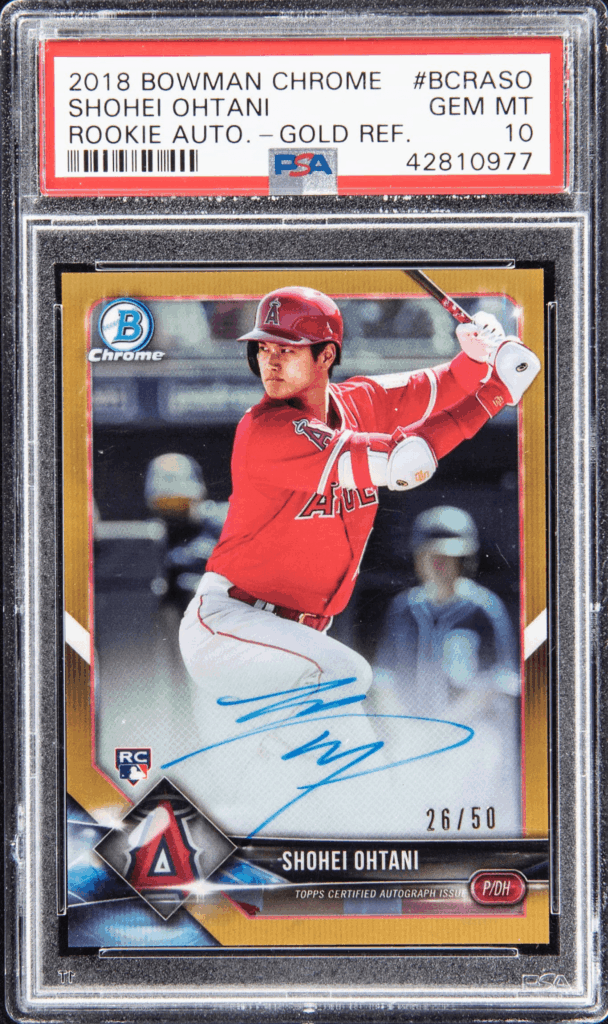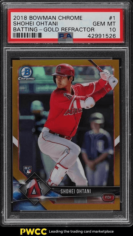 The 2018 Bowman Chrome Shohei Ohtani #1 (Batting-Gold Refractor) is among the rarest, with only 18 PSA 10 copies.