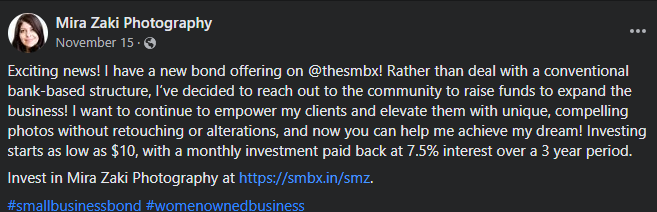 There are a number of small business owners who are excited to share their bond offerings from SMBX on social media. The business owners share details about their small business and what they want to do with the funding they receive through SMBX.