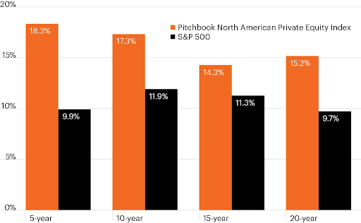 The performance data speaks for itself. Over the past 5, 10, 15, and 20 years, private equity has consistently outperformed the S&P 500. The chart below highlights this trend, showing how private equity has delivered returns that surpass public markets, reinforcing its role as a valuable addition to an investment strategy.